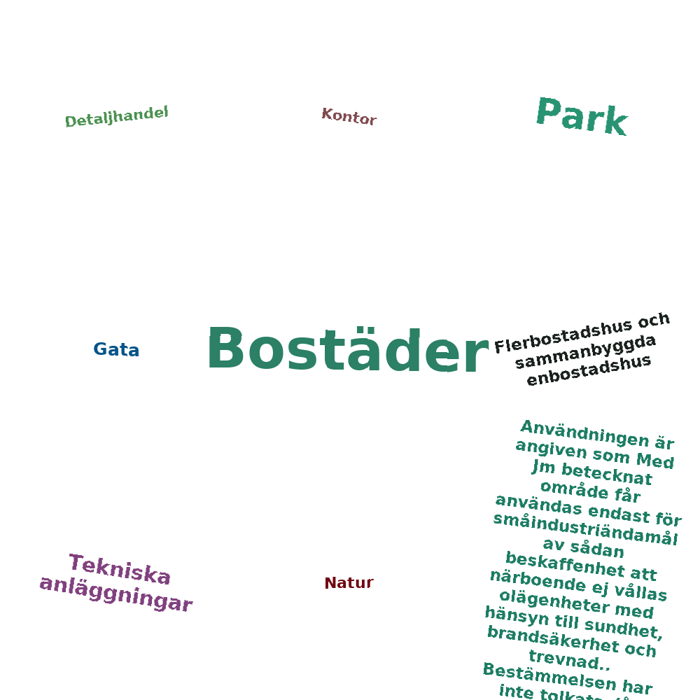 • Användningen är angiven som Med Jm betecknat område får användas endast för småindustriändamål av sådan beskaffenhet att närboende ej vållas olägenheter med hänsyn till sundhet, brandsäkerhet och trevnad.. Bestämmelsen har inte tolkats då kategorisering saknas.. (3)