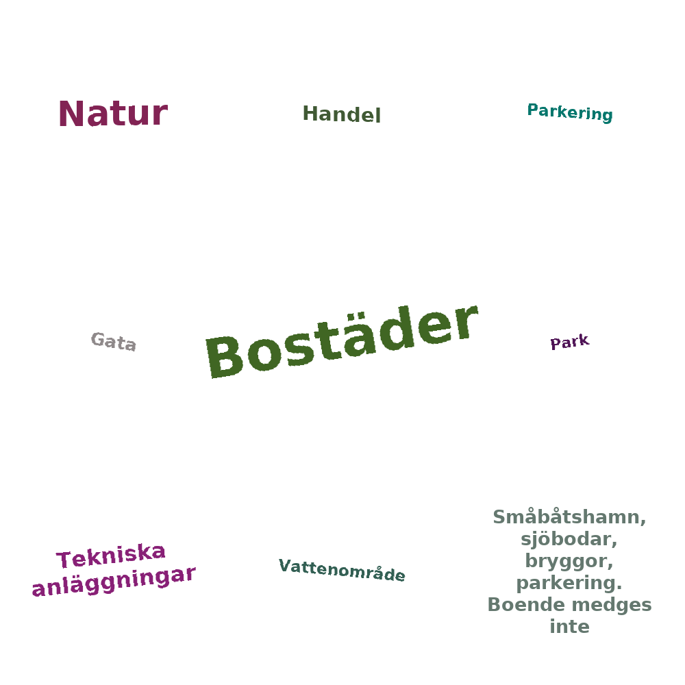 - Småbåtshamn, sjöbodar, bryggor, parkering. Boende medges inte (13)
